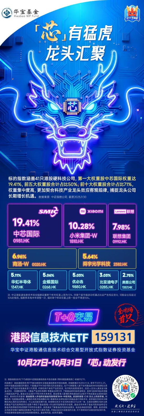 全市场首只!聚焦港股“半导体芯片”硬科技赛道的港股信息技术ETF(159131)正在火热发行中。标的指数涵盖41只港股硬科技公司,第一大权重股中芯国际权重达19.41%,前五大权重股合计占比50%,前十大权重股合计占比71%,权重集中度高,更加契合科技产业龙头效应客观规律,捕捉龙头公司长期增长机遇。