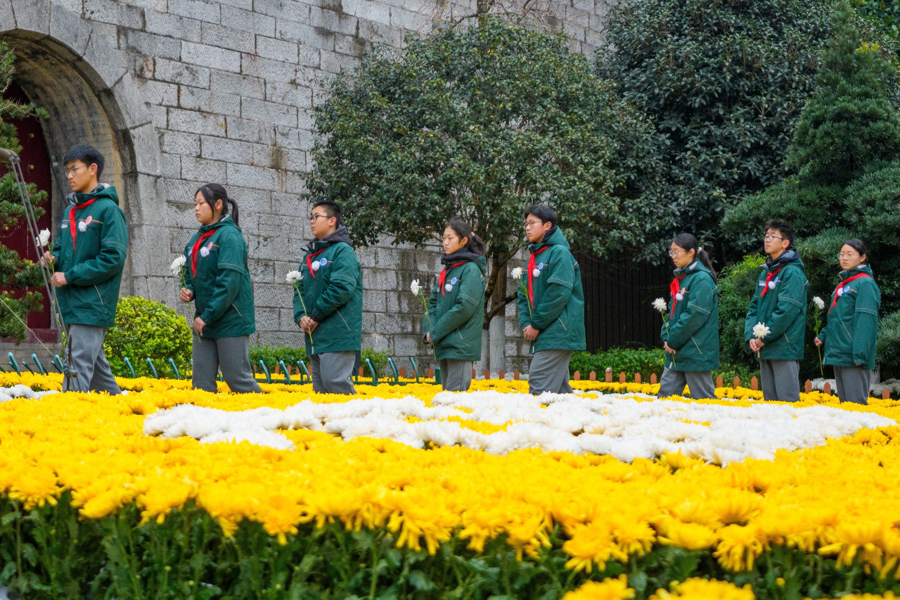12月13日,学生在位于江苏南京的侵华日军南京大屠杀死难同胞丛葬地(正觉寺)参加悼念活动。新华社发(杜懿摄)